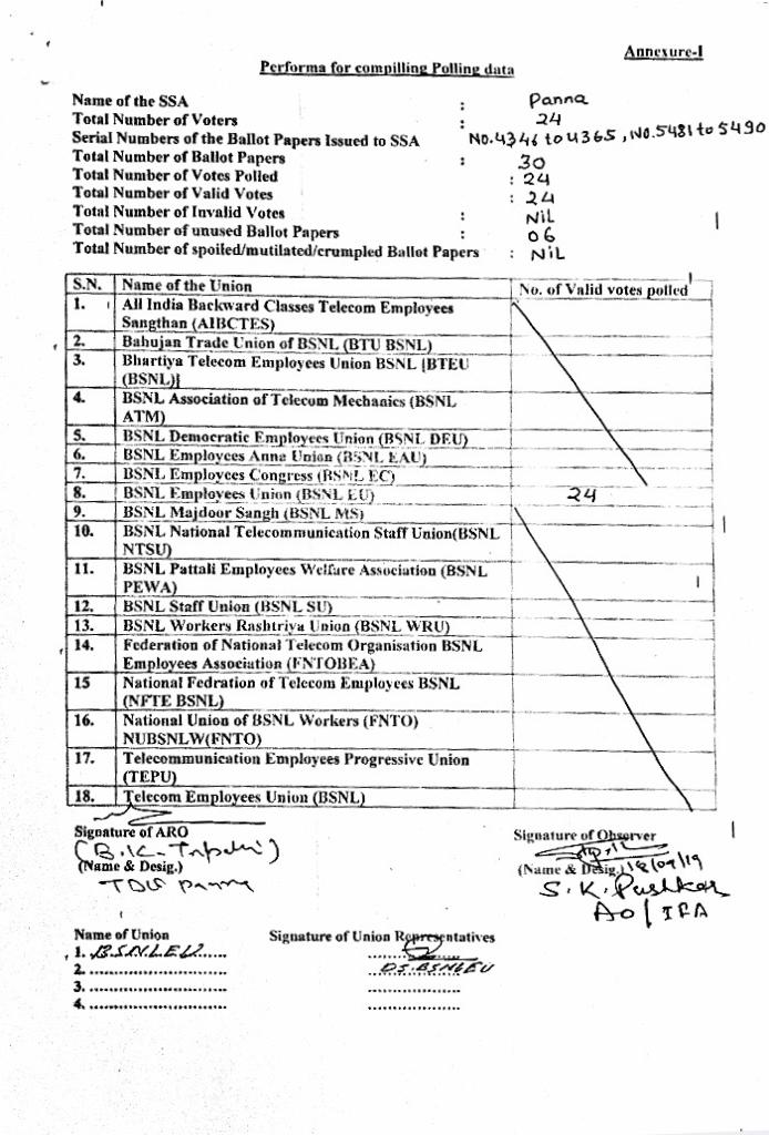 हमारे परिमंडल में स्थित पन्ना एसएसए में अन्य यूनियन का एक भी सदस्य नही है। सारे साथी BSNLEU के ही सदस्य हैं। उनकी पूर्ण आस्था BSNLEU में ही है। और इसी आस्था के चलते, रीवा  हॉस्पिटल में भर्ती कॉम सूरत लाल पांडेय, TT वोट देने पन्ना आए। 8वें मेम्बरशिप वेरिफिकेशन में वोट डालने की इच्छा प्रकट करने पर पन्ना के जिला सचिव कॉम पाठक अपने साथियों के सहयोग से रीवा हॉस्पिटल में भर्ती कॉम पांडेय को, हॉस्पिटल से अनुमति ले कर, पन्ना लेकर आए, वोट डलवाया और पुनः उन्हें रीवा हॉस्पिटल में भर्ती कराया। कॉम पाठक द्वारा प्रेषित जानकारी अनुसार...
