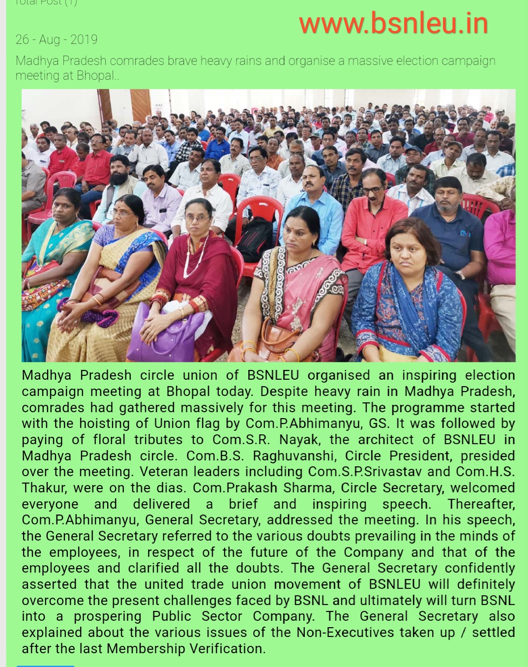 विभिन्न स्थानों पर हुई BSNLEU की  सभाओं में  हमारे साथियों की अभूतपूर्व और उत्साहपूर्ण उपस्थिति इस बात की संकेतक है कि BSNLEU, मध्यप्रदेश परिमंडल में एक बड़ी जीत की ओर अग्रसर है।