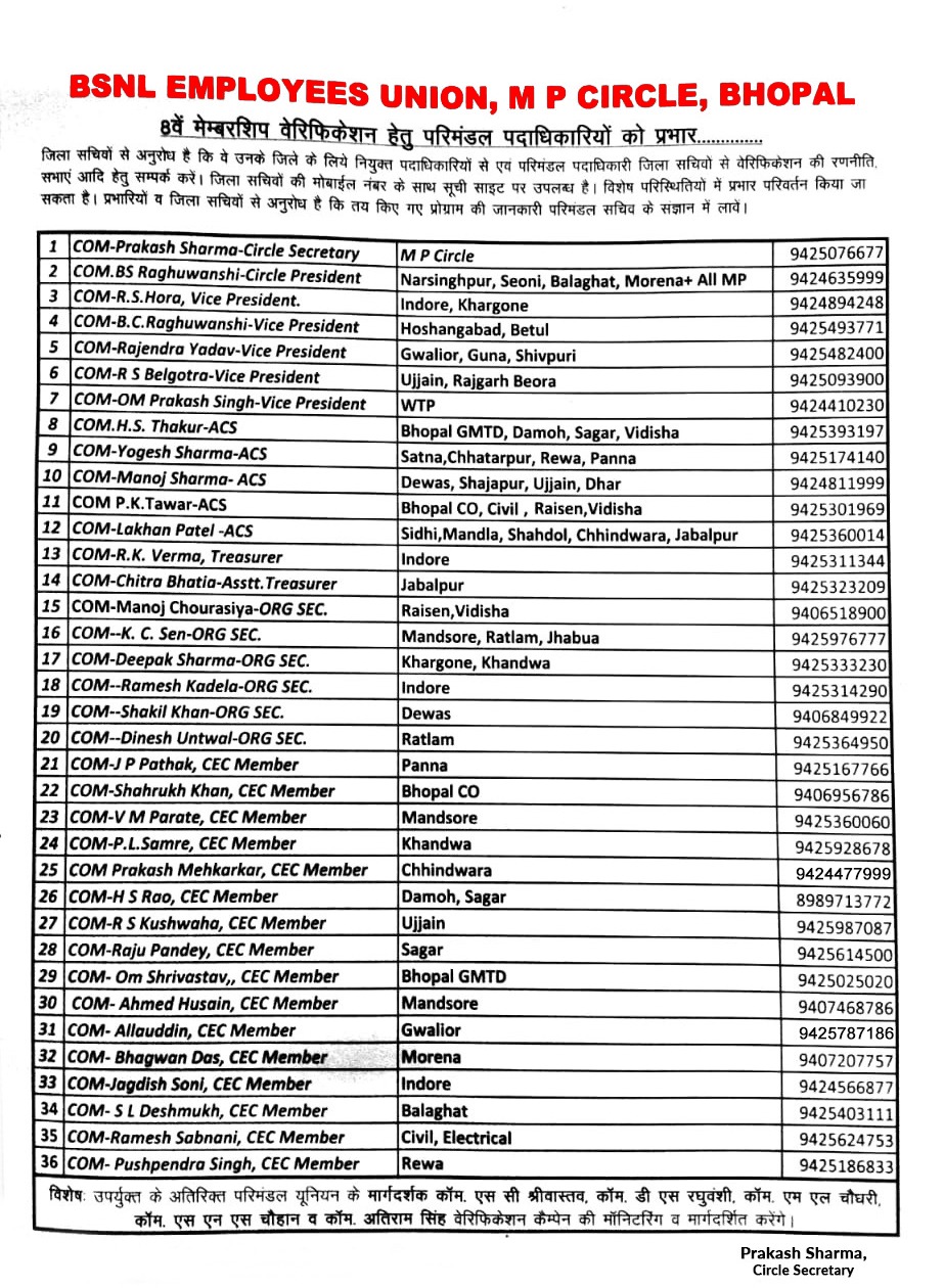 8वें मेम्बरशिप वेरिफिकेशन के लिए BSNLEU परिमंडल पदाधिकारियों को विभिन्न एसएसए का प्रभार सौंपा गया है। प्रभारी परिमंडल पदाधिकारी व संबंधित जिला सचिव आपस में चर्चा कर आगामी वेरिफिकेशन हेतु प्रभारी की मीटिंग व प्रचार हेतु रणनीति तय करेंगे। वें अनुपालन पूर्व परिमंडल सचिव/अध्यक्ष से भी परामर्श करेंगे।