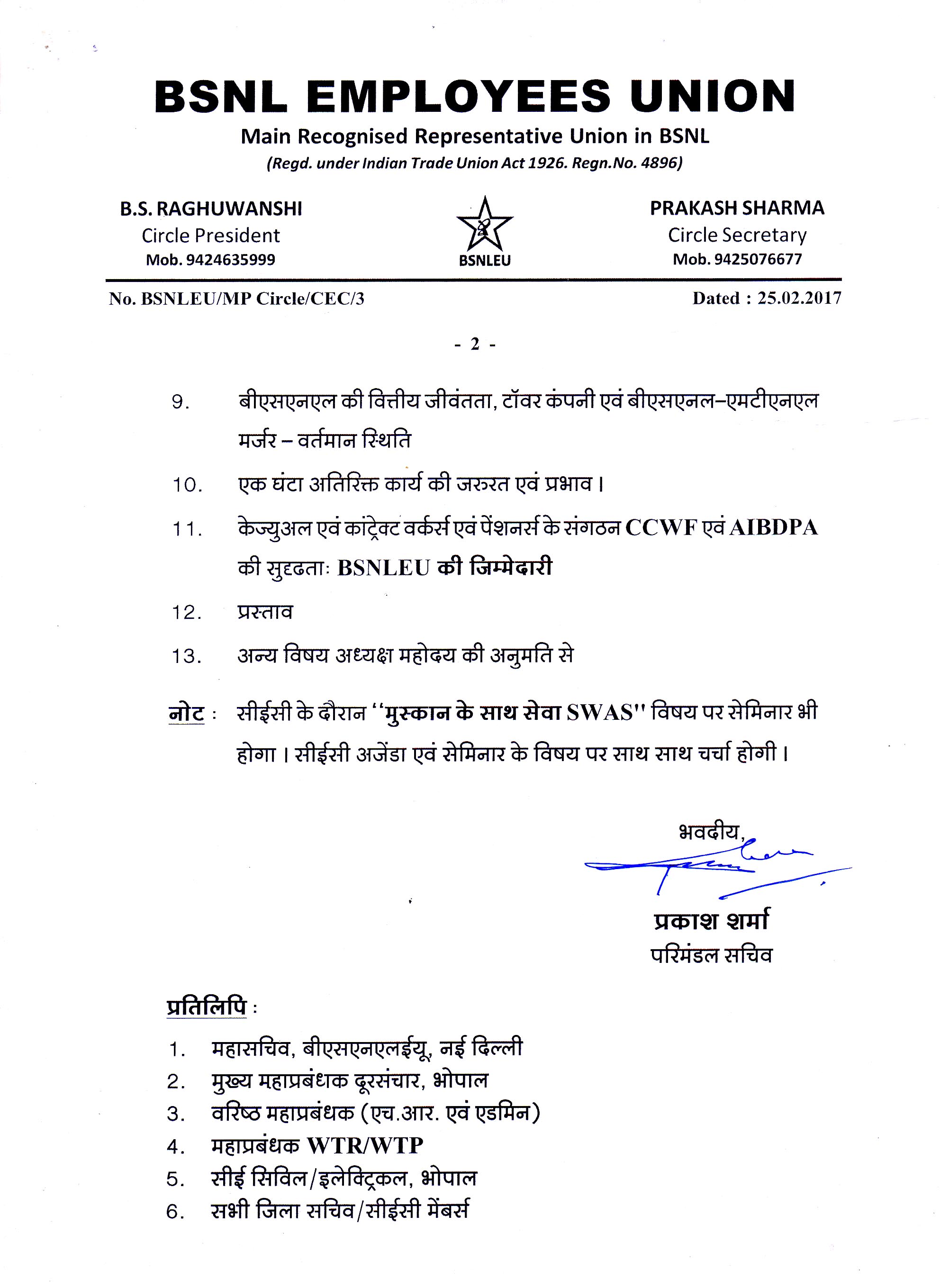 कॉम प्रकाश शर्मा व कॉम रघुवंशी 23.02.2017 को भोपाल मे सभी यूनियन्स व एसोसिएशन्स के परिमंडल सचिवों के साथ 9 मार्च के " मार्च टू राज भवन/ कलेक्टोरेट " कॉल को सफल बनाने की रणनीति पर विचार विमर्श करेंगे।
