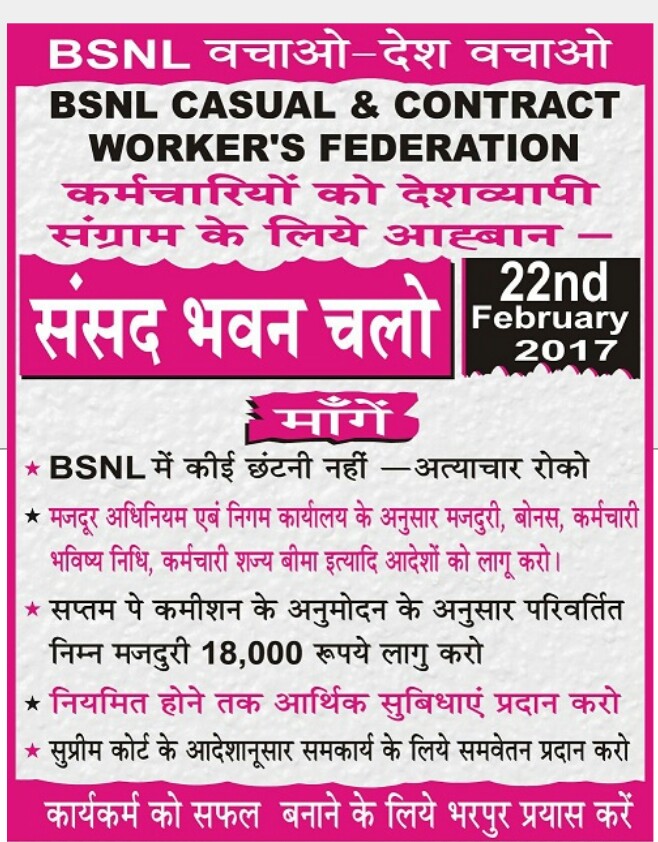 कैजुअल एंड कॉन्ट्रेक्ट वर्कर्स दिनांक 22.02.2017 को अपनी विभिन्न माँगों को ले कर ईस्टर्न कोर्ट , सीटीओ भवन, जनपथ, नई दिल्ली से सुबह 10 बजे रैली निकालेंगे। रैली जंतर मंतर पर ख़त्म होगी। रैली मे लगभग 2500 साथी शामिल होने की सम्भावना है। जंतर मंतर पर सभा को कॉम तपन सेन, कॉम अनिमेष मित्रा, कॉम पी अभिमन्यु, कॉम नम्बूदिरी आदि संबोधित करेंगे।