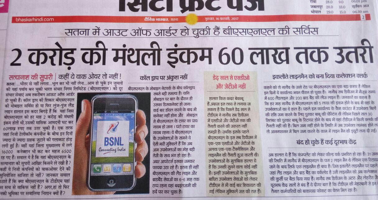 व्यवस्था (सिस्टम) की इस अवस्था मे सुधार की गुहार हमारे बेहद सक्रिय जिला सचिव कॉम योगेश शर्मा कई बार लगा चुके हैं, आंदोलन किये हैं । उधर सतना के अख़बार भी बीएसएनएल की दृत गति से गिरती सेवाओं पर कई बार विलाप कर चुके हैं.... परिमंडल नेतृत्वकर्ता स्थिति से प्रबंधन को अवगत करा चुके हैं, परिमंडल सचिव, अध्यक्ष , उपाध्यक्ष ने उच्च प्रबंधन का 25 जनवरी की मीटिंग मे ध्यानाकर्षण कर चुके हैं, पुनः 2 फ़रवरी 2017 को परिमंडल सचिव एवं माननीय सीजीएम स्थिति मे सुधार हेतु समझाईश दे चुके हैं....हर शक्खस चिंतित है....