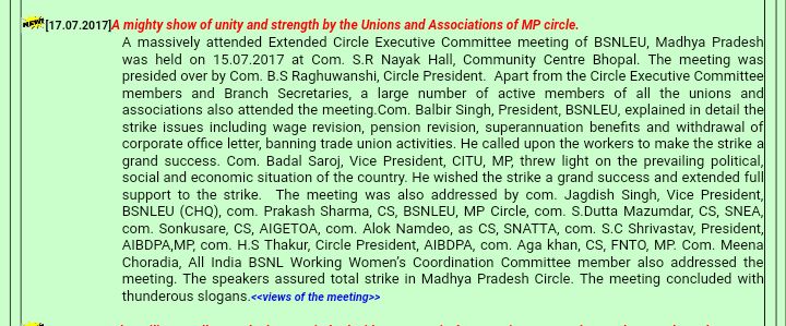 15 जुलाई 2017 को भोपाल में सीईसी भी होना है। अपने साथियों के साथ भोपाल पहुंचें, यह निवेदन। हमारे राष्ट्रीय अध्यक्ष कॉम बलबीर सिंह हड़ताल के मुद्दों पर विस्तृत रूप से जानकारी देने हेतु विशेष रूप से भोपाल आ रहे हैं।
